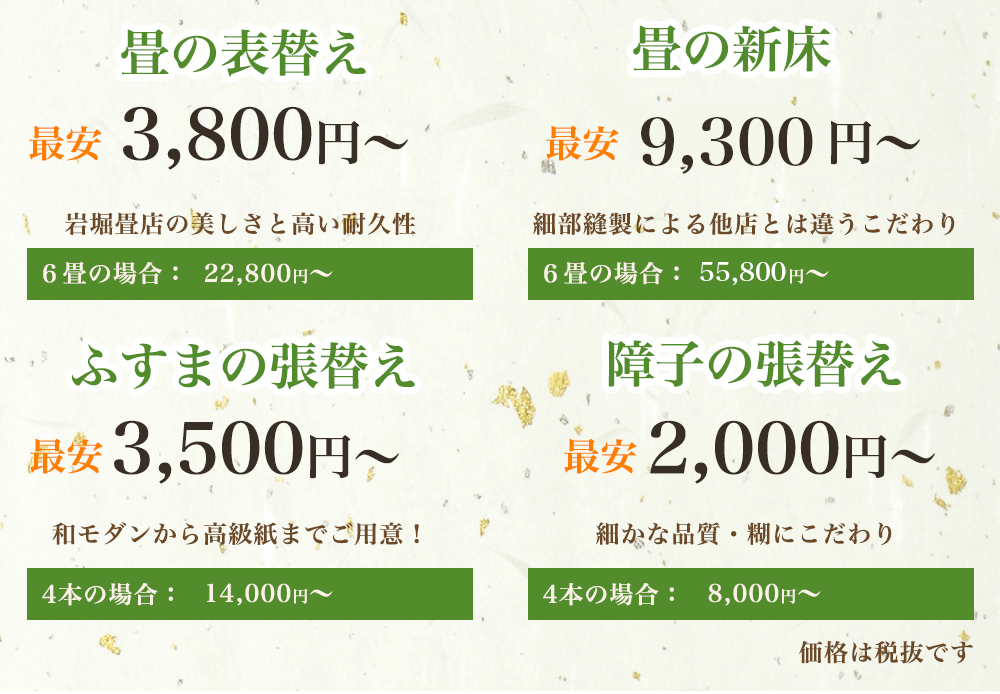※畳のサイズが五八間(178cm×89cm以下)の価格です。本間(191cm×95.5cm)などの場合は別途お問い合わせください。