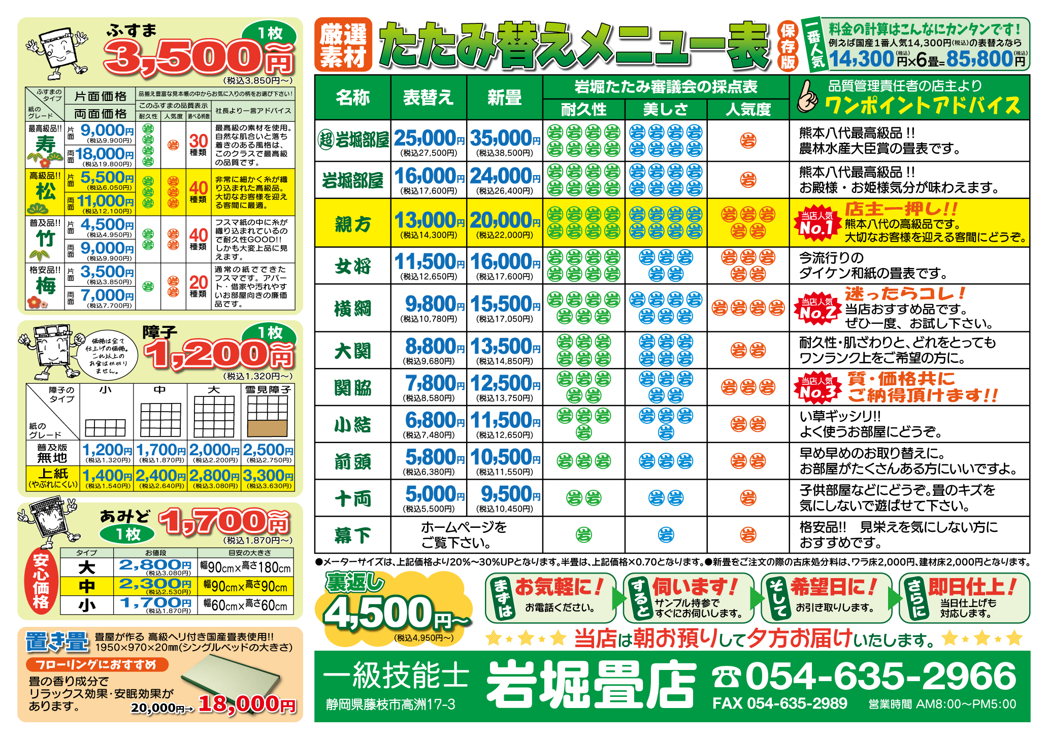 スピーディな畳の表替えは岩堀畳店におまかせください!最短で朝取りに伺い、午前中の当日納品も可能です!一級技能士が専門機械と技で、高品質なサービスをご提供させていただきます。たたみ、網戸、ふすま、障子でお困りでしたら、お気軽にご相談ください!お見積りご相談無料です!